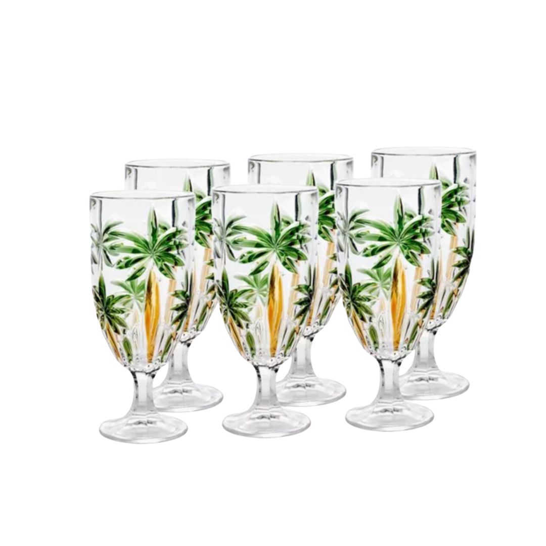 Este Jogo de 6 Taças para Água ou Suco de cristal de alta qualidade e lindos desenhos de palmeira pertence à linha Palm Tree HandPaint da marca Wolff.